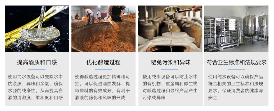 白酒中水的含量非常高,如果使用未經(jīng)處理的自來(lái)水或地下水,其中可能存在各種雜質(zhì)和微生物等,這些物質(zhì)會(huì)影響酒的風(fēng)味和品質(zhì)。而使用純水設(shè)備可以有效去除水中的雜質(zhì)、微生物和化學(xué)物質(zhì),使得生產(chǎn)出的白酒口感更好,品質(zhì)更為純正