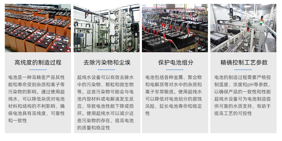 超純水設備可以提供高純度的水質,用于電池的制造過程。電池是一種高精密產品,其性能和壽命受到雜質和離子等污染物的影響。通過使用超純水,可以降低雜質對電池材料和結構的不利影響,確保電池具有高純度、可靠性和一致性