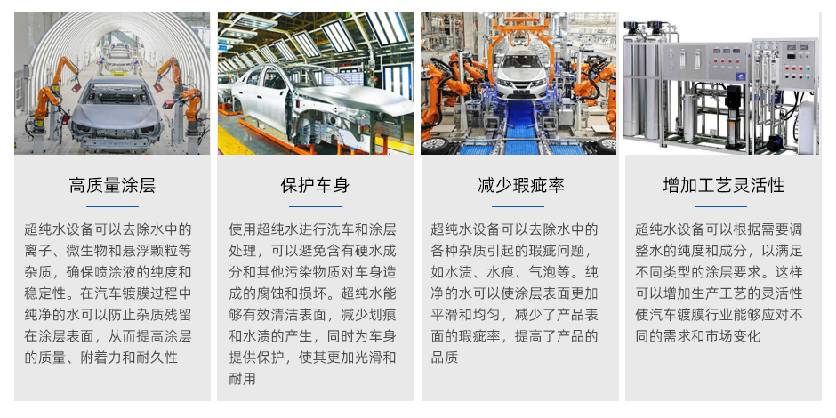 在汽車鍍膜過程中,需要使用無雜質的高純度水來清洗、處理和沖洗車身表面,以便保證涂層的附著力和光澤度。如果使用普通自來水或其他含有雜質和有機物的水,則可能會導致涂層出現氣泡、脫落或者其他不良影響,從而降低產品質量和穩定性。而使用超純水設備可以消除水中所有雜質和有害物質,使得涂層過程中使用的水質更加純凈、穩定和可控,從而提高產品質量和穩定性。此外,超純水還具有良好的化學穩定性和電學特性,不會對涂層產生任何影響,因此在汽車涂裝和鍍膜過程中被廣泛應用。
