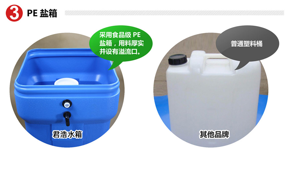 提示:君浩鹽箱采用食品級PE,并設有儲鹽隔板、鹽井、溢流口讓樹脂再生效果更好