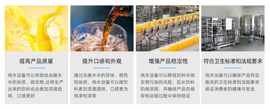 飲料中水的含量非常高,如果使用未經處理的自來水或地下水,其中可能存在各種雜質、重金屬、細菌和病毒等,這些物質會對產品的色澤、口感和品質產生影響,甚至會對人體健康造成危害。因此,使用經過嚴格處理的純水,可以避免以上問題,保證飲料的品質。